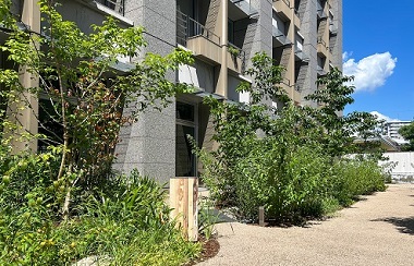 CFK大阪本社オフィスのリニューアル(2025年)では、敷地内に雨水の流出抑制や地下水の涵養に効果がある雨庭(あめにわ)を整備しました。在来種を中心に四季の移ろいを感じられる植物を植え、歩いて楽しめる設えとしています。