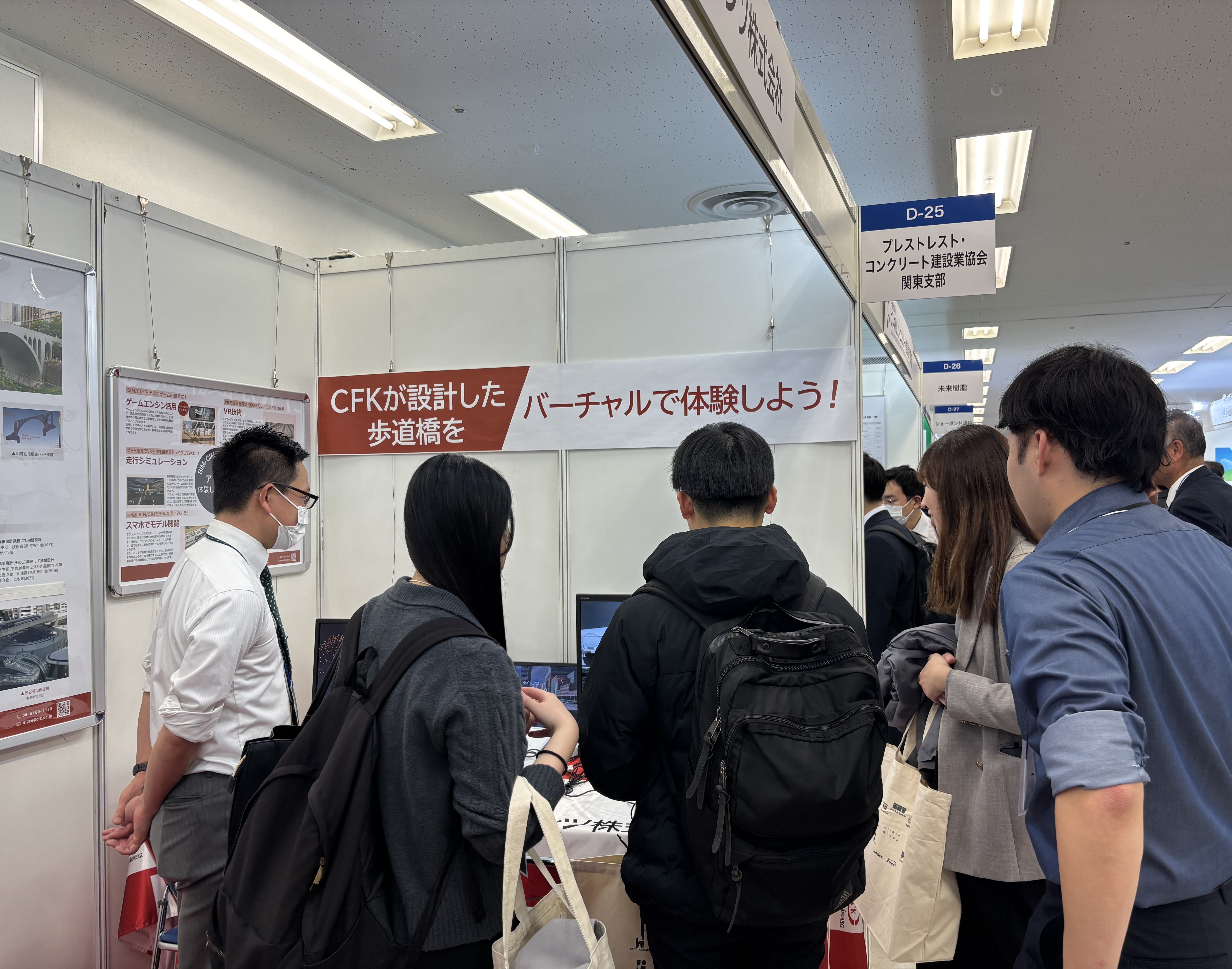 大人気のICT体験 2025年11月19日(水)~11月20日(木)の2日間、サンシャインシティ展示ホールC・Dにて開催された「建設技術展2025関東」が大盛況のうちに閉幕しました。 今回のブース展示では、CFKが設計した渋谷東口歩道橋や阿倍野歩道橋を3Dモデル化して、様々なICT活用を体験できるブースとしました。 お忙しい中CFKブースへお立ち寄りいただき、誠にありがとうございました。