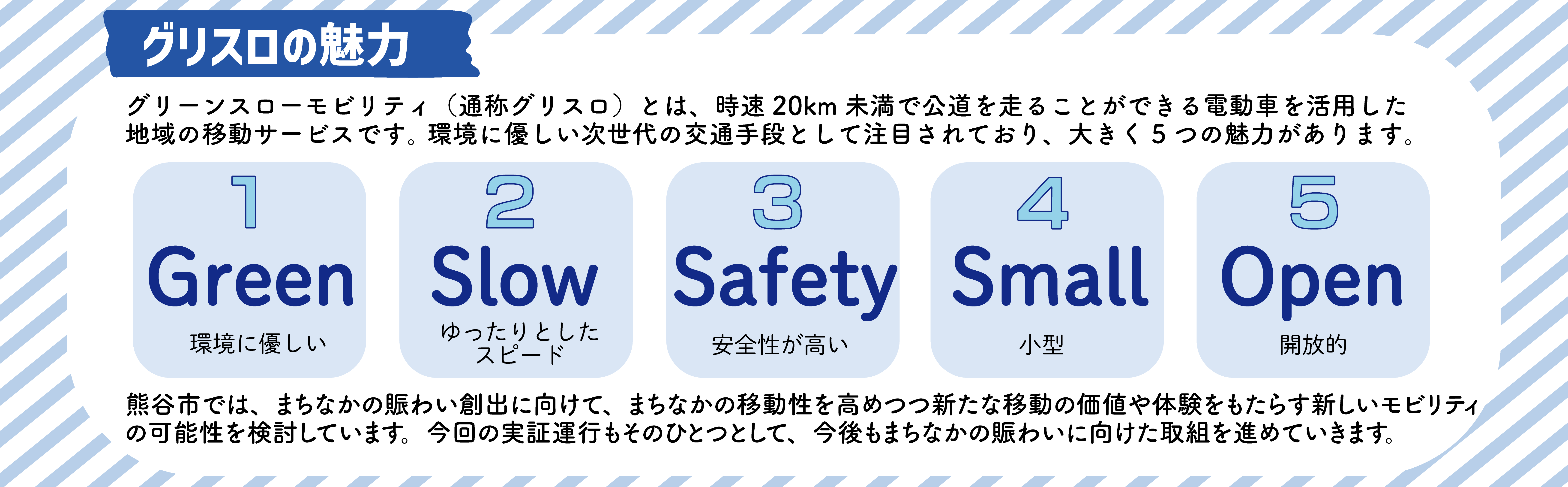 CFKは令和6年度より当運行実証の企画を進め、地域関係者の方々との勉強会や、既にグリスロが本格運行する地域での体験試乗会の開催を通じて、熊谷市初となるグリスロ運行のあり方を検討してきました。本運行実証では、同時期に星川通り周辺で実施される他の社会実験とも連携しつつ、エリアの活性化につなげる運行実証を目指しています。
