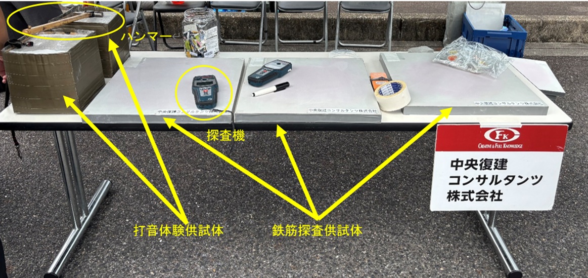 CFKは以下の内容の展示物にて、出展致しました。それぞれの項目についてパネルを作成し、何のためにするのかを説明し、実際に供試体によりゲーム感覚で、道路構造物の維持管理の一部分を体験してもらうことを目的にしています。