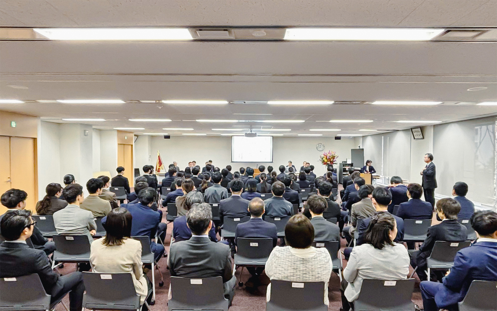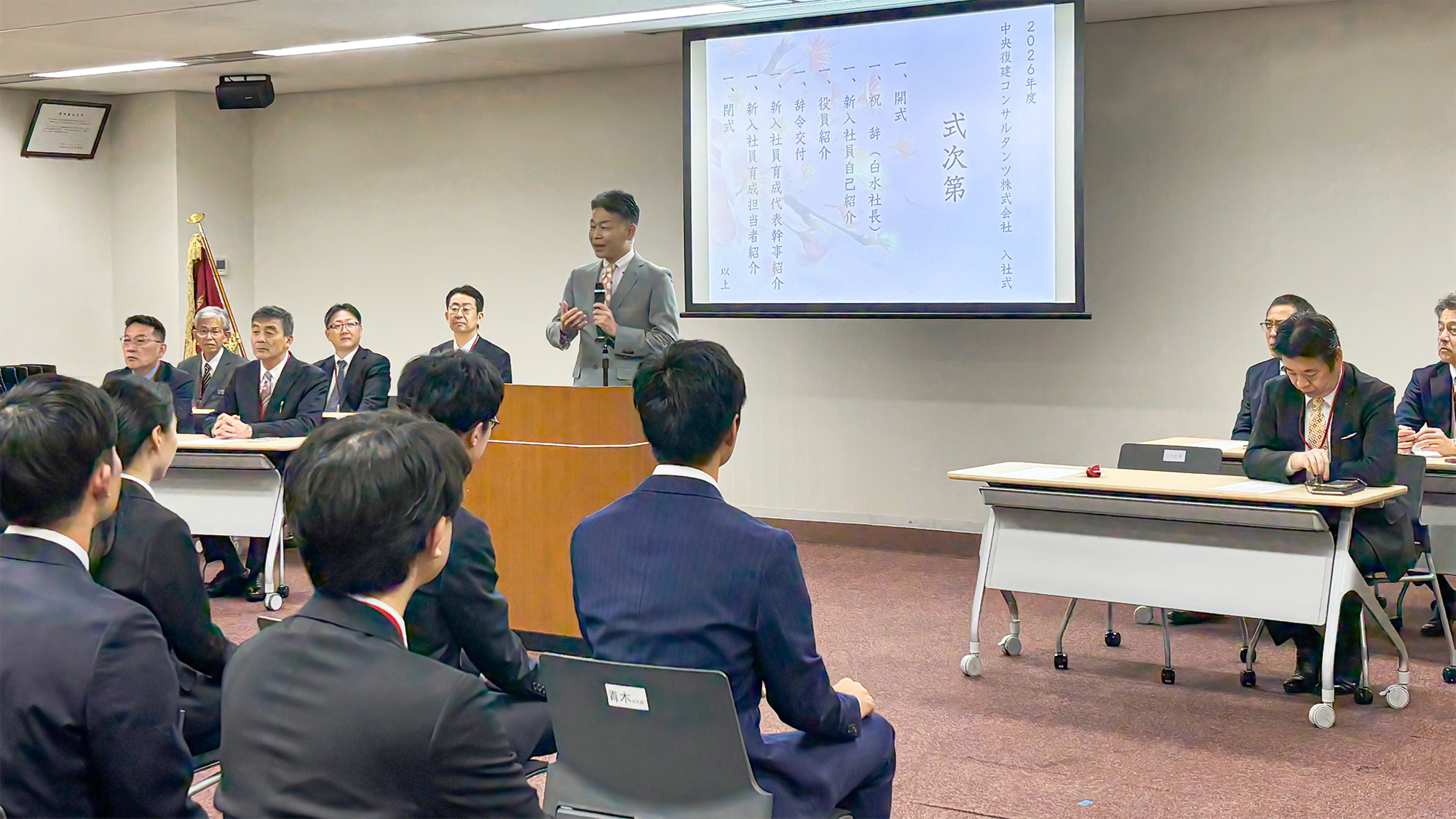 2026年4月1日、大阪本社にて2026年度入社式を執り行いました。 当日は37名の新入社員を迎え、社長による祝辞、新入社員自己紹介などを行いました。 新たな仲間とともに、CFK全体でさらなる成長を目指してまいります。 入社式の様子。後方席では育成担当が新入社員を温かく見守ります 白水社長より、新入社員の皆さんへ歓迎の言葉 新入社員の皆さんから一人ずつ自己紹介と抱負を発表していただきました