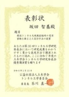 2025年11月20日(木)~21日(金)に実施された第35回トンネル工学研究発表会(土木学会)において、優秀講演賞を受賞いたしました。