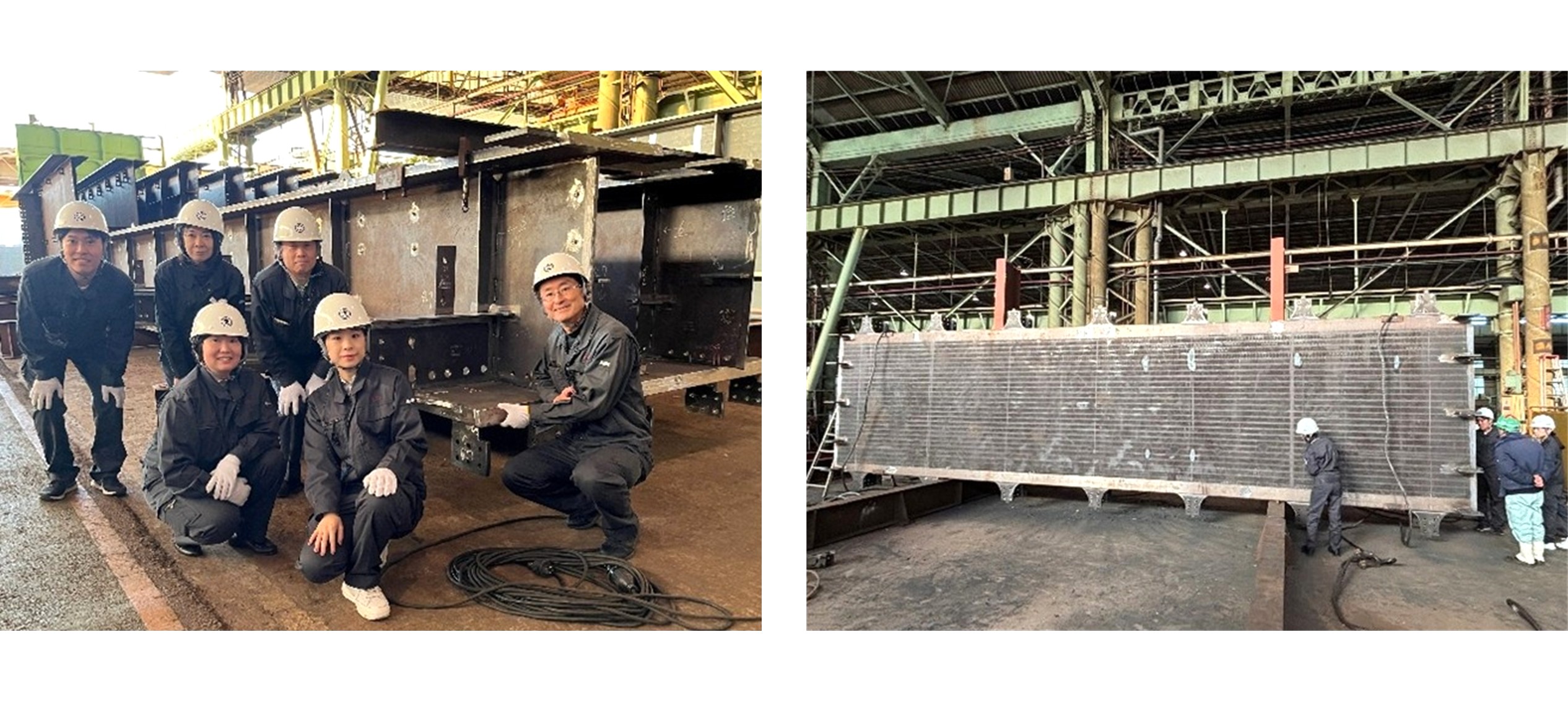 視察では、設計図と実際の構造や溶接形状を比較するとともに、溶接部の仕上げ状況を確認しました。鋼桁の下フランジ幅は2420mm と身長以上の寸法であり、実物のスケール感(写真:下段右)に圧倒されるなど、鋼桁製作の現場を体感する貴重な機会となりました。