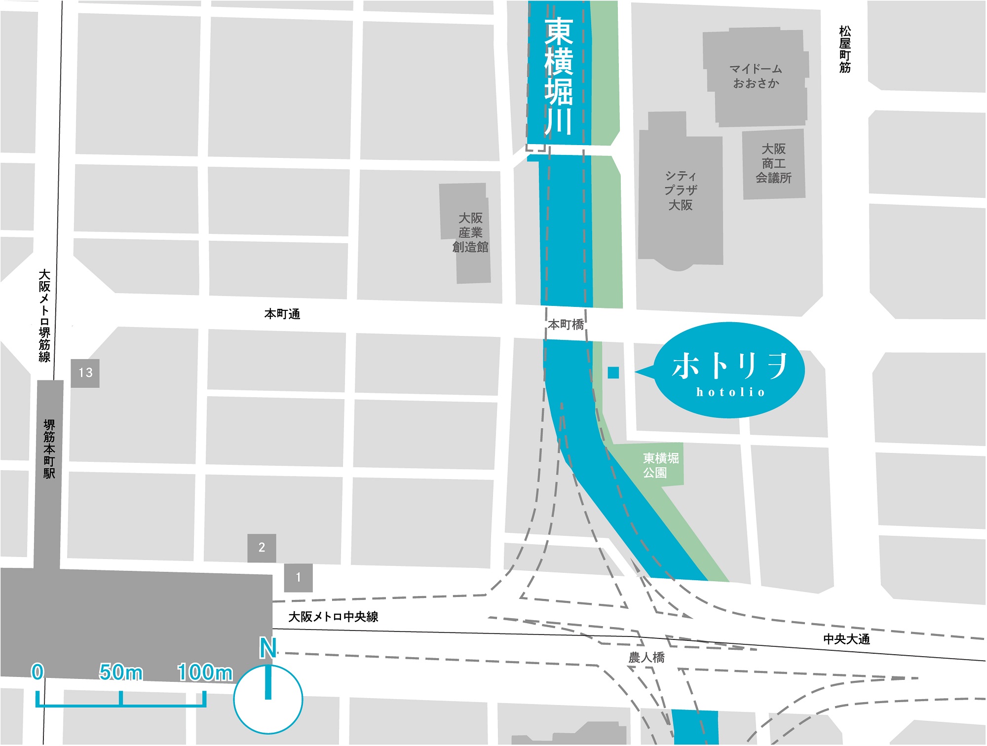 東横堀川は大阪都心を南北に流れ、中之島と道頓堀を結ぶ約2.4kmの川です。水都大阪を象徴する「水の回廊」の一角ですが、川の上空に阪神高速道路の高架橋がかかり、存在感がありません。しかし今後大阪市により、20年程度をかけて東横堀川全川で耐震護岸への改修と遊歩道整備が目指されています。2025年4月には、その先行区間として本町橋~農人橋右岸側約200mの遊歩道が開通しました。ホトリヲはその一角に位置しています。