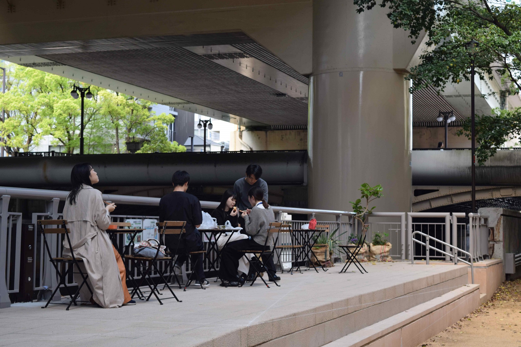 川側を開放したことで、遊歩道のテラス席を自由に使う様子が見られます。遊歩道にはCFKが河川管理者(大阪市)から占用許可を受けて、社会実験的にテラス席を設置しています。ホトリヲのことを見て、東横堀川沿いの事業者から川側に出入り口を設けたいと相談を受けています。高速道路により日当たりは今ひとつでも、風や視線が抜け、開放感のある川沿いは、都心の中で貴重な環境です。そのような環境をより多くの人に実感してもらい、遊歩道沿いの建物が川側の活用を活性化し、にぎわいを創出してほしいです。