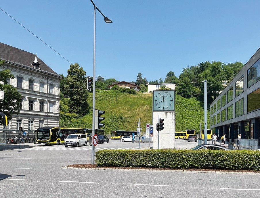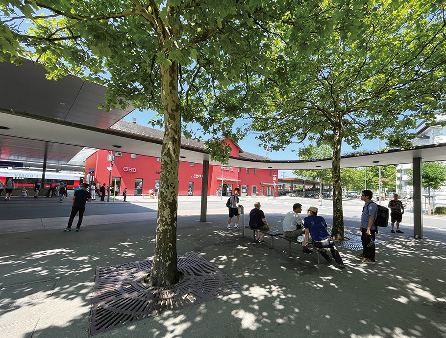 オーストリアではスイスとの国境に位置するフォアアールベルク州の3都市(フェルトキルヒ、ドルンビルン、ブレゲンツ)を視察しました。いずれも人口は5万人程度の都市ですが、1時間に片方向4本の鉄道とそれらに合わせてバス路線が各拠点駅で接続するタクトダイヤが組まれています。平日の日中時間帯においても日本の地方都市のような閑散とした鉄道・バスではありませんでした。また、日本やイタリアとは異なり、オーストリアやスイスは信用乗車方式であるため、駅に改札がありません。そのため、街から駅への動線や駅の反対側への動線確保等設計の自由度はかなり高い印象を受けました。そして、駅前広場は使ってもらいたい交通モードの順に、広場の中心からバスターミナル、自転車駐輪場、駐車場という配置で自然と公共交通や自転車移動を促す配置となっていました。