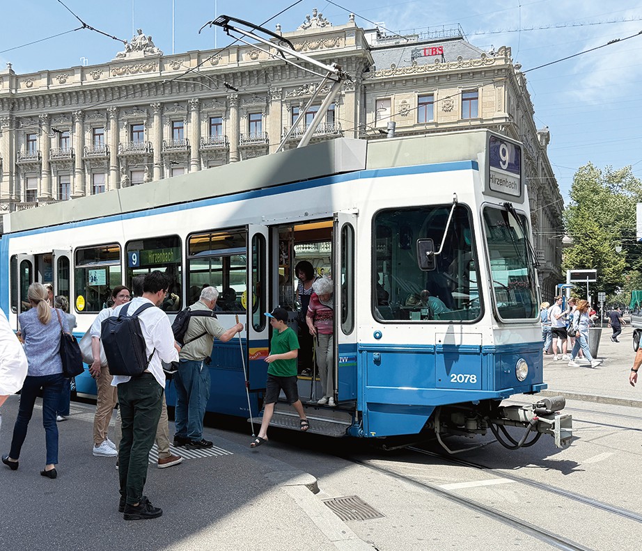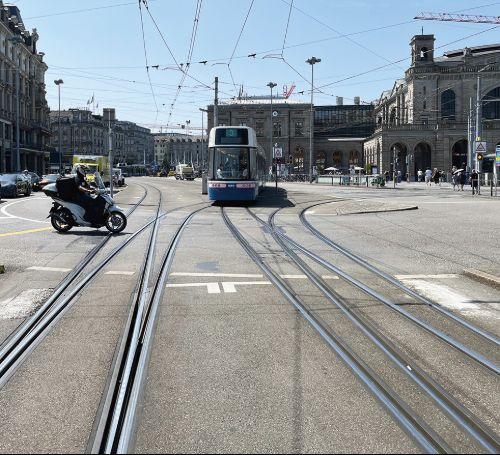 チューリッヒ都心部の公共交通ではトラムとバス路線が網の目のように張り巡らされていました。Google mapsの乗換案内にも対応しており移動に不自由はありませんでした。一方で、スイスは時計が有名であり、公共交通機関にも高い定時性が求められているようで、自動車と同じ車道上を走ることもあるトラムは少し余裕のあるダイヤ設定となっていたのか、距離の割には移動に時間がかかっていたように感じました。また、街を歩いた印象としては、トラム>歩行者>自転車>自動車の順に優先されているようでした。