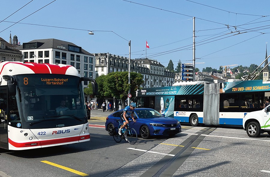 スイスで印象的だったのは自転車とトラムの普及です。スイスの各都市では自転車レーンが整備されており、日本でもよく見る歩道側の車道の端だけでなく、各車線の端に自転車レーンが整備されていました。とても怖くて自転車を乗りこなす自信もなければ、設計すると考えた時点でかなりの恐怖がありました。