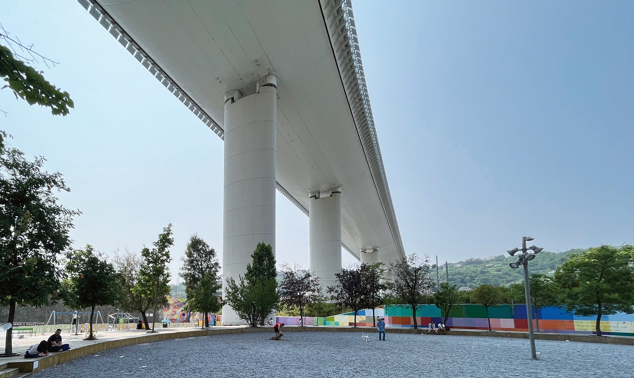 サンジョルジョ橋は2018年、供用中に崩落したモランディ橋の代わりに2020年に再建された橋梁です。モランディ橋の崩落により43人の命が失われました。レンゾ・ピアノ氏は出身地であるジェノバでの2つの悲惨な出来事を受け、まちのシンボルの復興に尽力しました。地震が比較的少ないジェノバでは、日本と比べると構造物はスリムでした。サンジョルジョ橋の上部工は、港湾都市に位置していることから、「谷間に停泊した船」の船体をイメージしており、設計にあたっては、模型による風洞実験がなされています。自身の設計に妥協しない姿勢は技術者として学ぶべきであると感じました。なお、サンジョルジョ橋は建設開始から15ヵ月で供用と、現地在住のガイドさんも驚くスピードでの再建となったようです。