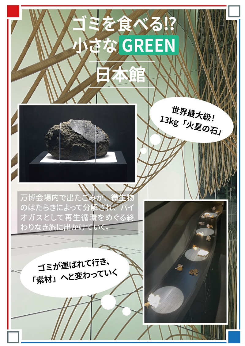 そのなかでも今回は、”GREEN”を中心に紹介します。ここでは紹介しきれないパビリオンは、独自にポータルサイトを作成したので、そちらもご覧ください。趣味趣向やテーマ、食など様々な角度から探すことができるようになっています。