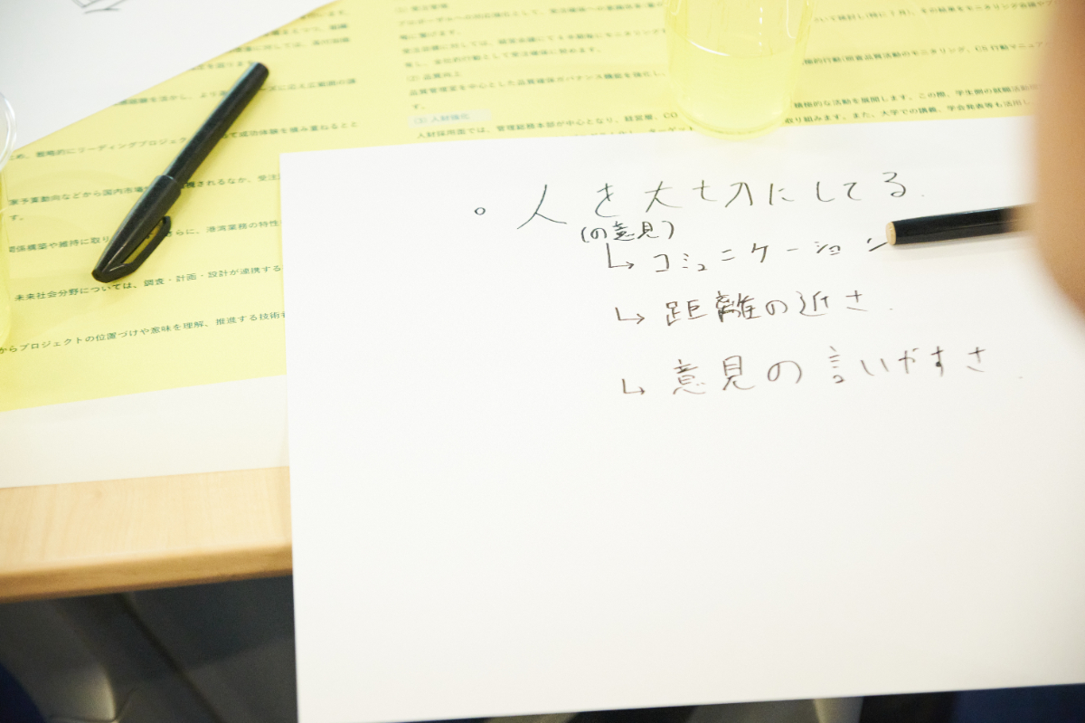 普段は同じプロジェクトを担当していない経営陣と若手社員たち。やや緊張しながらの挨拶とともに話し始めたのですが、さすがは多くの社員が“自社の魅力は人”と語るCFK。年齢やキャリアの差を感じさせない気持ち良い雰囲気が一気に広がります。経営陣が口火を切って、会話を盛り上げてくれているようにも映りました。「CFKのいいところ・自慢できるところ(=DOYA!)」をテーマにしたアイスブレイクの時間でも、「人が好き」「なんでも物申しやすい!」などの声もあがり、皆さん納得の様子。